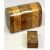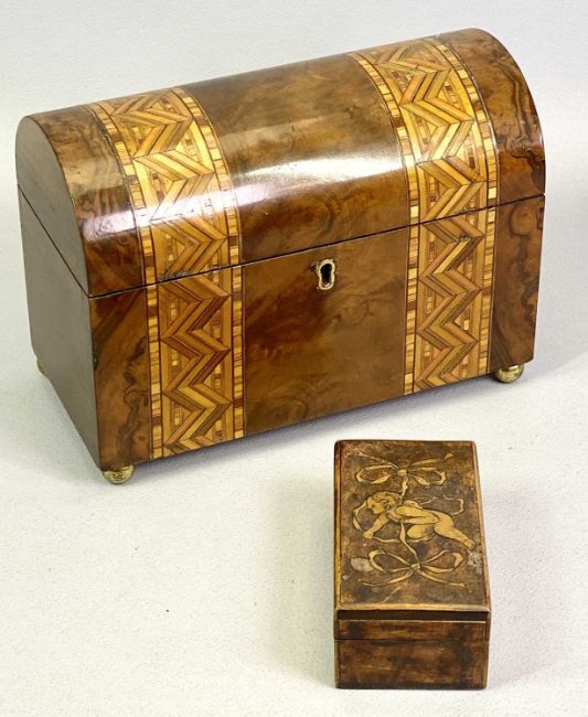 VICTORIAN DOMED TOP WALNUT DOUBLE TEA CADDY - having two bands of parquetry inlay and gilded ball feet, 16cms H, 22cms W, 11cms D, with a rectangular stained wood box, the hinged cover and pen work decoration of a cherub and ribbons, divided interior, 4.5cms H, 6cms W, 11cms D