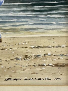 IEUAN WILLIAMS (1991) watercolour - figures and dog on beach by Beaumaris Pier, signed lower right, 38 x 61cms, IEUAN WILLIAMS artist proof print - Menai Bridge, signed and dated 2007 in pencil, 36 x 55cms, AUDREY HIND limited edition colour print (4/100) - 'Mynydd y Garn', signed, titled and numbered in pencil, 38.5 x 49cms and JOHN FIELDER limited edition colour print (117/500) - Achmelvich Sands, numbered in pencil, 47 x 61cms, all unframed