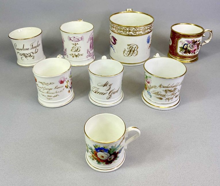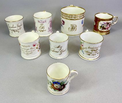 ENGLISH PORCELAIN MUGS - 19th century, a collection of 8, hand painted with floral sprays and other scenes with gilded highlights, some named and with initials Copeland, Derby, ETC, 12.5cms H the largest