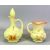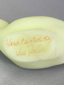 FENTON BURMESE GLASS - 3 items with hand painted floral decoration, bird hand painted by Sue Foster, 17.5cms L, jug hand painted by S Barlow, 11cms H and oil bottle with stopper, hand painted by Frances Burton, 19cms H