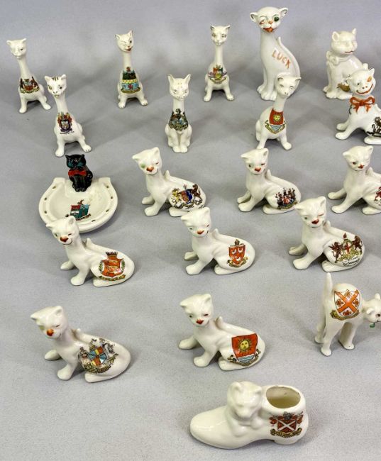 CRESTED WARE CATS COLLECTION – 32 items with crests for Southend on Sea, Bristol, Norwich, Paddington, Coventry, Llanelly, Bexhill on Sea and numerous others