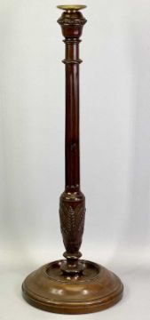 A TALL TURNED MAHOGANY CANDLESTICK - early 19th century, the column fluted and carved with wheatsheafs on circular dish base with removable brass sconce, 60.5cms H