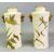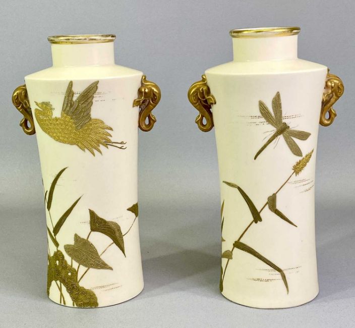 ROYAL WORCESTER IVORY VASES, A PAIR - early 20th century, of cylindrical waisted form, gilded decoration of birds, flowers, dragonflies and butterflies with elephant head side handles, puce mark and green mark, 22.5cms H