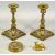 GILDED CAST BRASS CANDLESTICKS, A PAIR - late 19th century with baluster stems and square bases, cast with leaves and on bracket feet, 18.5cms H, a miniature gilded cast bronze figure of a sacred cow modelled lying down, with chased decoration, 4cms H and a circular brass one pound weight with GR and VR stamps, 7cms diameter