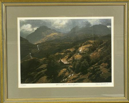ALAN STARK watercolour - fishing boats by lighthouse, signed lower left, 15.5 x 22cms and DAVID WOODFORD limited edition colour print (55/850) - Blaen y Nant, Nant Ffrancon, signed, numbered and titled in pencil, 23 x 31cms