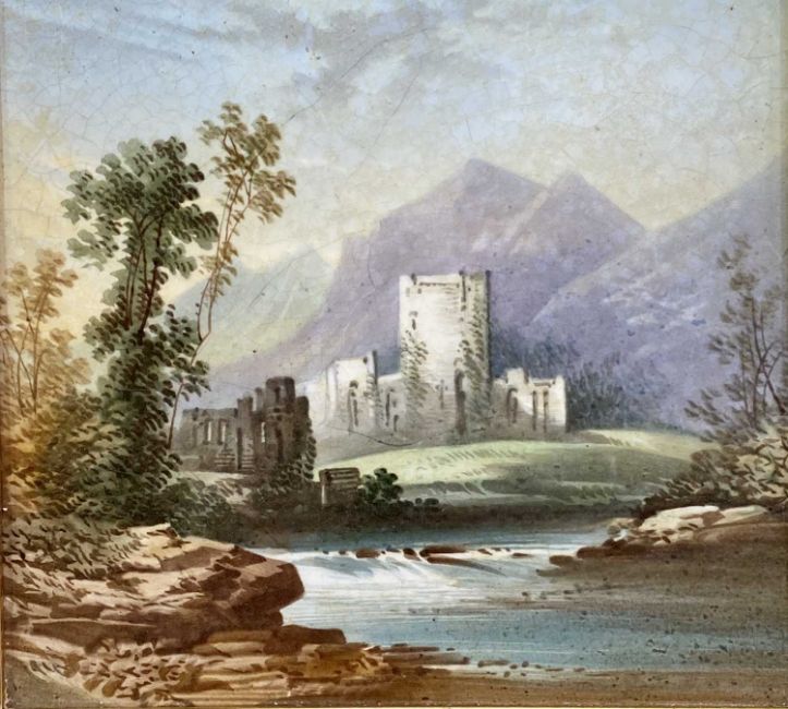 POSSIBLY DAVENPORT TILES, A PAIR - painted by Daniel Lucas, 'Lakeside castle ruins', in gilded frames, 16 x 16cms