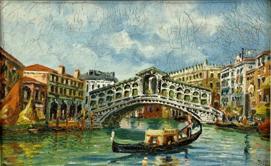 PERRY (British 20th century) atmospheric oil on board - boats in harbour with Conwy Castle, signed lower left, 55 x 38cms, a pair of 20th century oils on canvas - Venetian views, 17 x 27cms and an oil on board - star constellation, 88 x 36.5cms