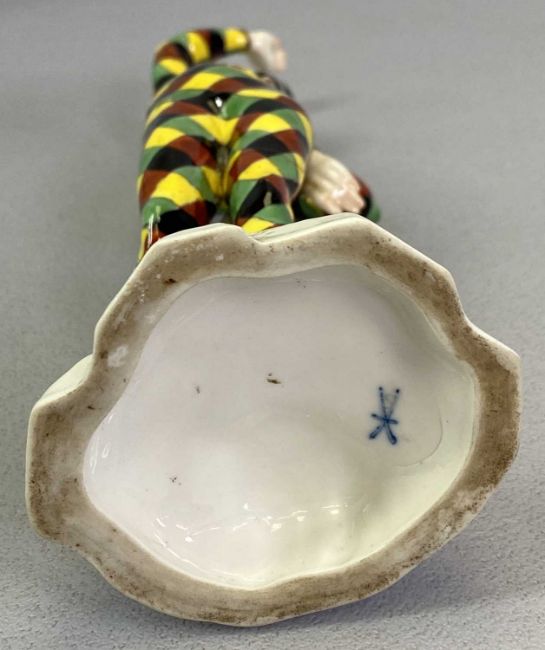 CONTINENTAL PORCELAIN FIGURINES GROUP and an armorial plate to include a possibly Samson figurine of a harlequin, 21.5cms H, underglazed blue cross swords mark, possibly Samson armorial plate with painted floral decoration and central coat of arms, 23cms diameter and two pairs of Rudolstadt Volkstedt porcelain figurines, one pair depicting women in draped robes modelled as a painter, the other a sculptor, 12.5cm heights, 'AD 1762' mark in underglaze blue, the other pair modelled as a young boy and girl, he carrying a goat over his shoulder, she carrying a spinner's yarn, 11.5cm heights