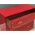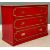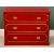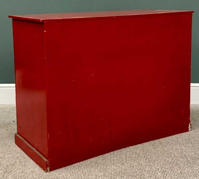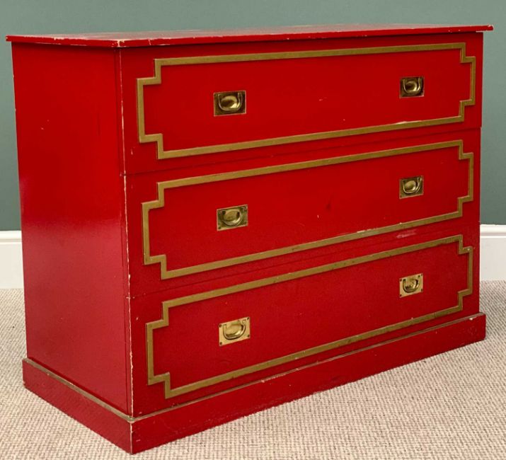 INTERESTING RED & GILT PAINTED CHEST - having three drawers, each inset with brass campaign style pull handles, on a plinth base, 77cms H, 102cms W, 46cms D