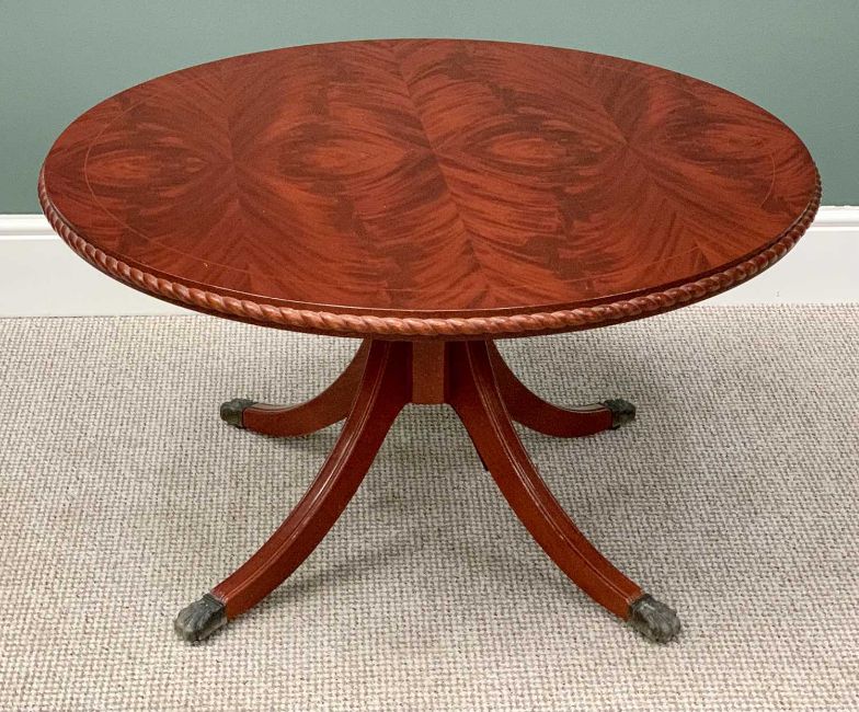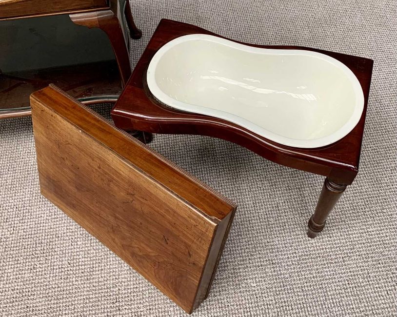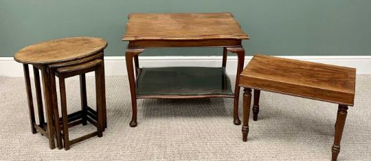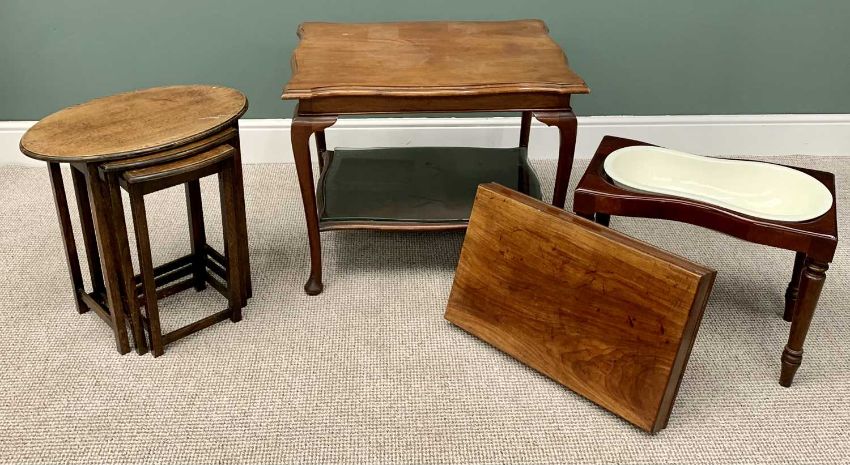 VICTORIAN & LATER FURNITURE ASSORTMENT (4) - to include a mahogany bidet with lift-off top and kidney shaped pottery bowl interior, on turned tapering supports, 46cms H, 60cms W, 37cms D, a nest of three tables, 55cms H, 55cms W, 37cms D the largest, mahogany shaped top two tier table, 61cms H, 76cms W, 61cms D and a reproduction mahogany circular coffee table on a turned column with splayed supports, 52cms H, 93cms diameter
