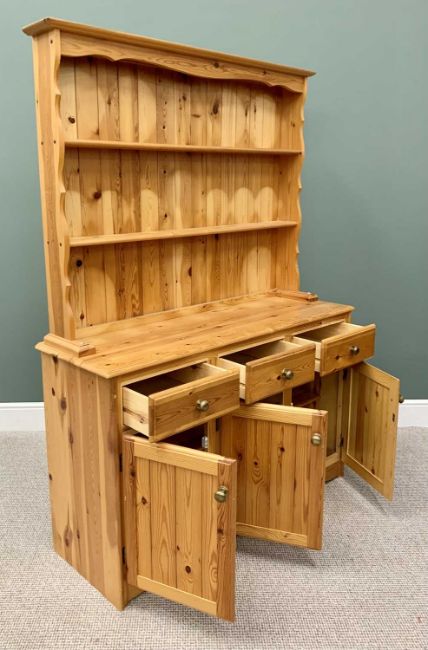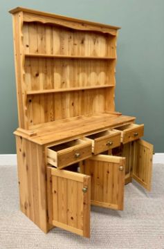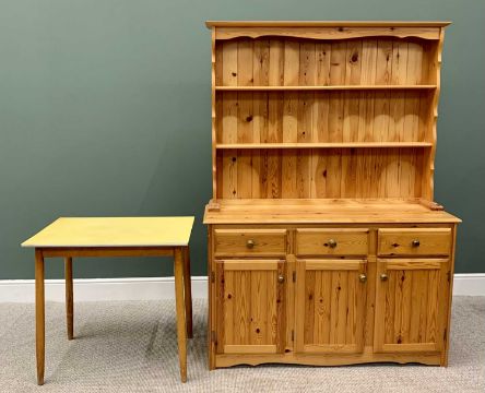 REPRODUCTION PINE KITCHEN DRESSER - having a two shelf rack over a base section of three opening drawers and three lower cupboard doors, with shaped apron to the front matching the upper cornice, 188cms H, 136cms W, 46cms D together with A FORMICA TOP KITCHEN TABLE