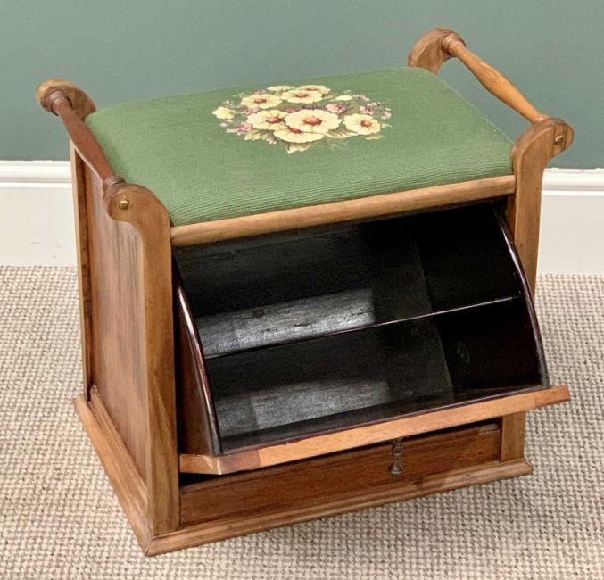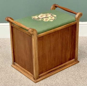 VINTAGE STRIPPED & WAXED FALL FRONT BOX SEAT STOOL - with green and floral tapestry top seat and twin carry handles, 47cms H, 55cms W, 33cms D