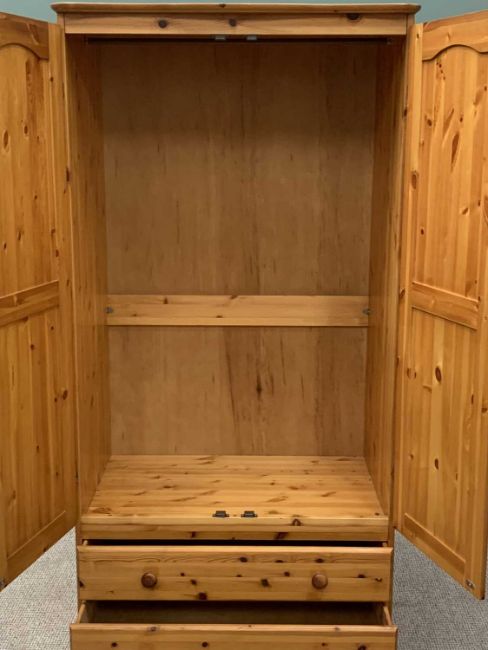 MODERN PINE BEDROOM FURNITURE - to include a deep two door wardrobe with two base drawers, 183cms H, 92cms W, 63cms D, a chest of two short over four long drawers, 108cms H, 85cms W, 46cms D, a bedside cabinet, 62cms H, 41cms W, 35cms D and a bed headboard, 111 x 133cms
