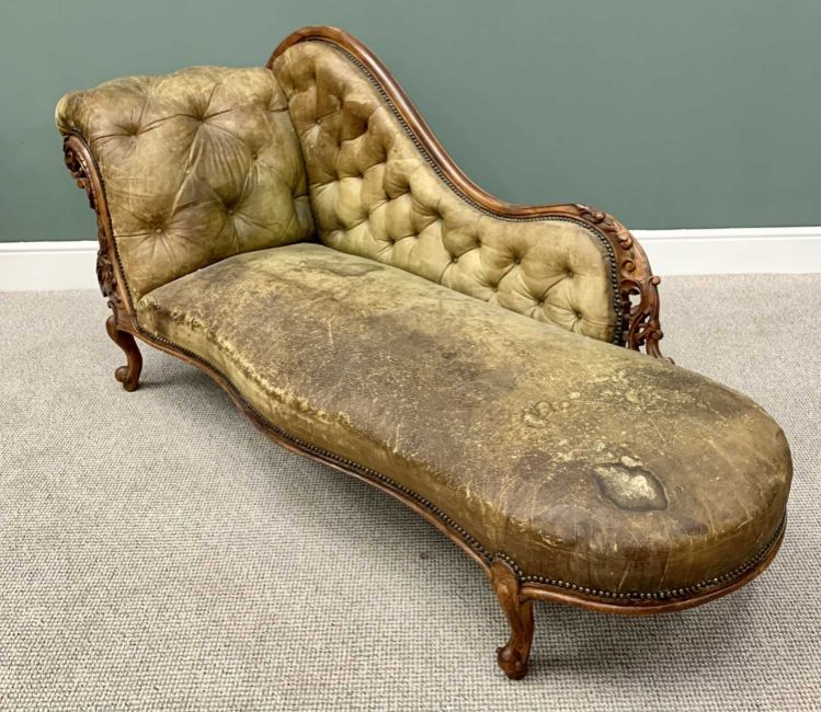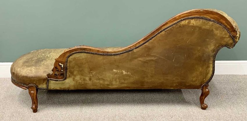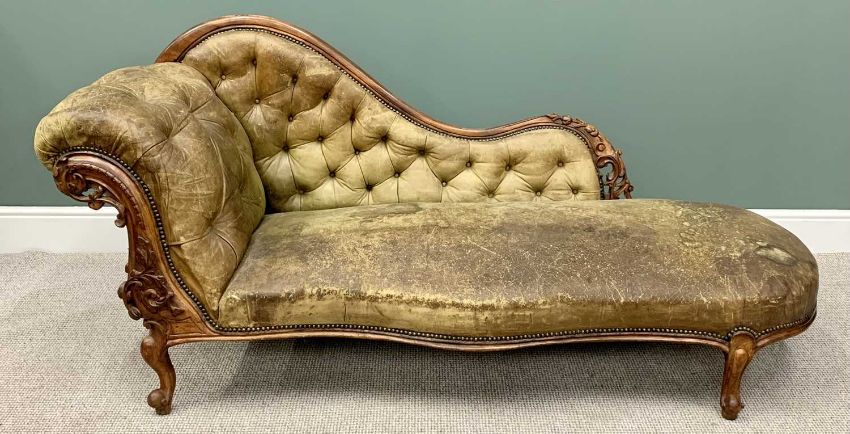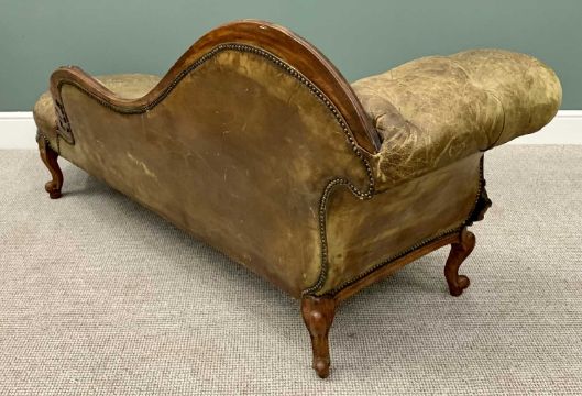 VICTORIAN MAHOGANY CHAISE LONGUE - button back leather upholstery having studded nail edging, the shaped back with open carved end detail, similar carving to the front, on shaped supports, 90cms H, 190cms L, 67cms D overall