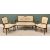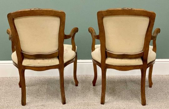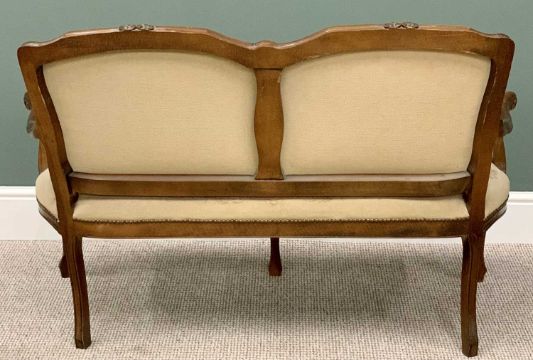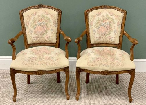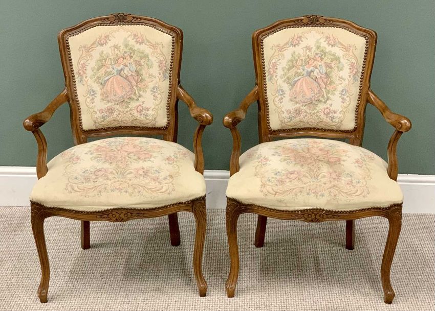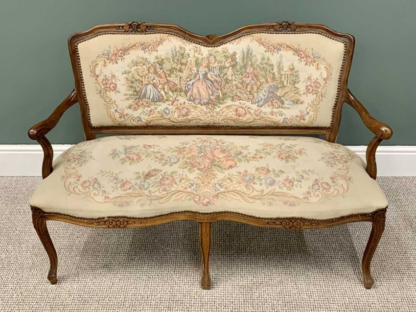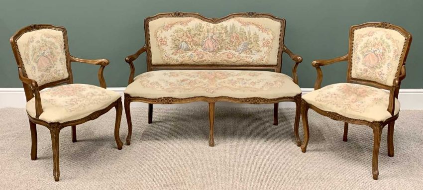DRAWING ROOM SUITE - reproduction with tapestry style upholstery, comprising two seater sofa, 83cms H, 120cms W, 40cms D and a pair of elbow chairs, 85cms H, 60cms W, 44cms D