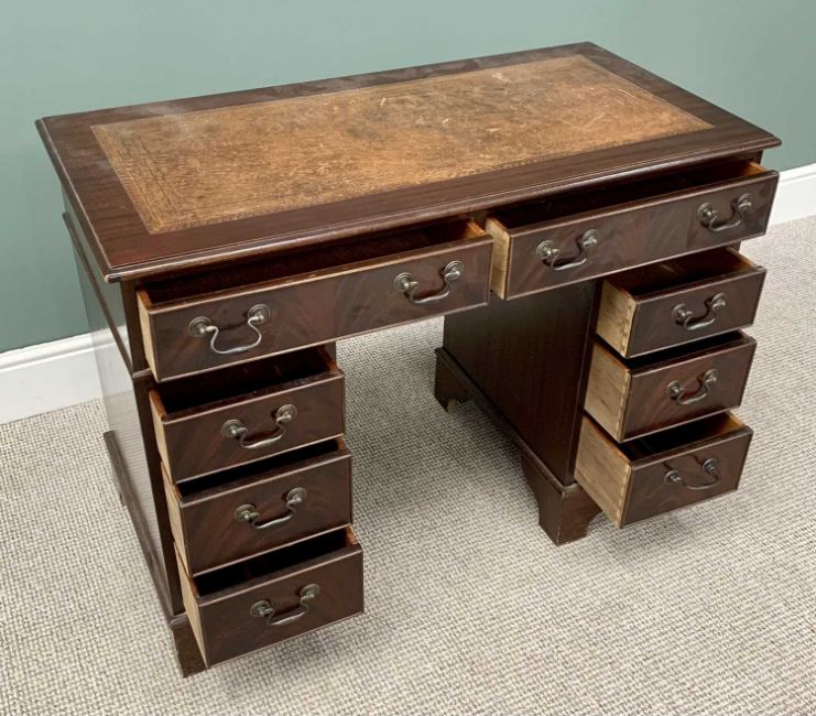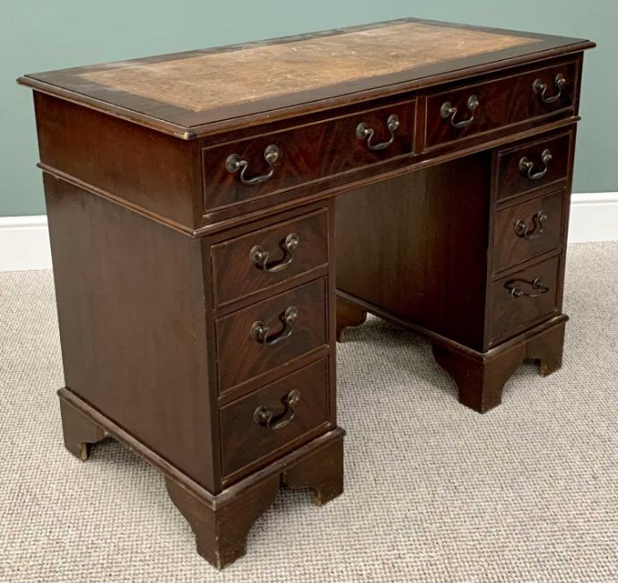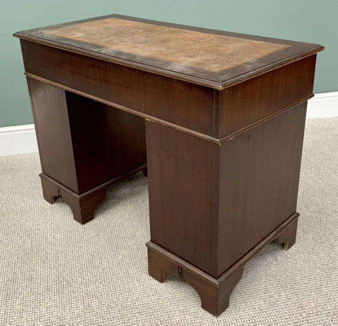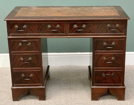 REPRODUCTION MAHOGANY TWIN PEDESTAL DESK - having a gilt tooled brown leather skiver over eight opening lower drawers and corner bracket feet, 80cms H, 107cms W, 54cms D