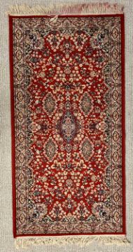 EASTERN STYLE RED GROUND WOOLLEN RUG - 176 x 91cms & AN ANTIQUE STYLE WALL TAPESTRY - with classical design, 193 x 120cms