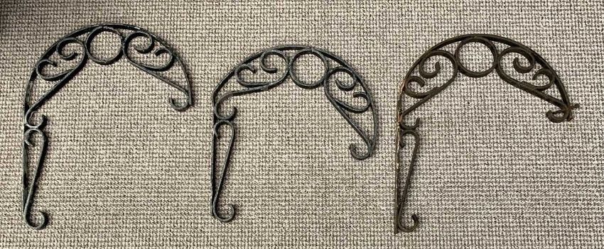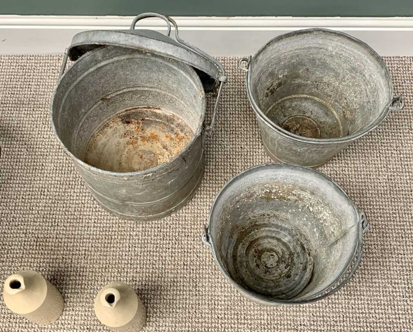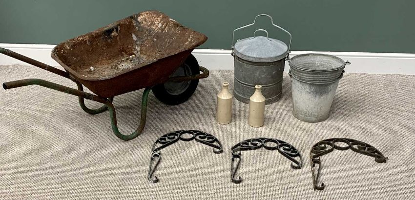 VINTAGE WHEELBARROW & CONTENTS - to include galvanized buckets and a lidded can, wrought iron wall brackets ETC