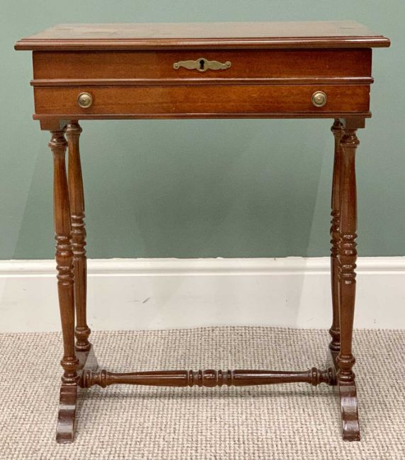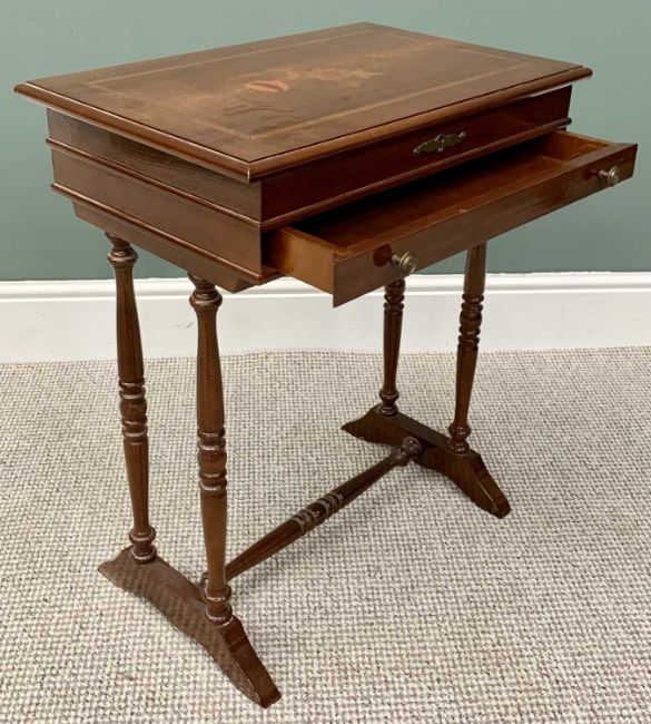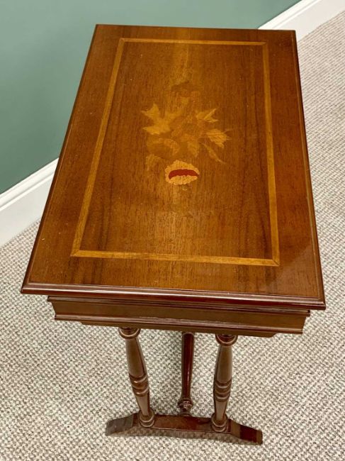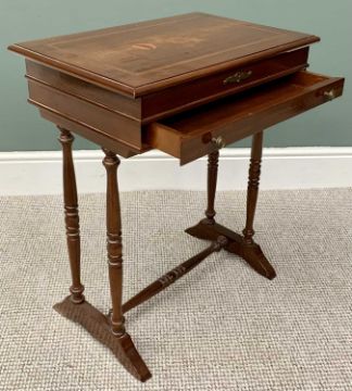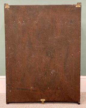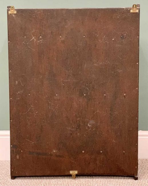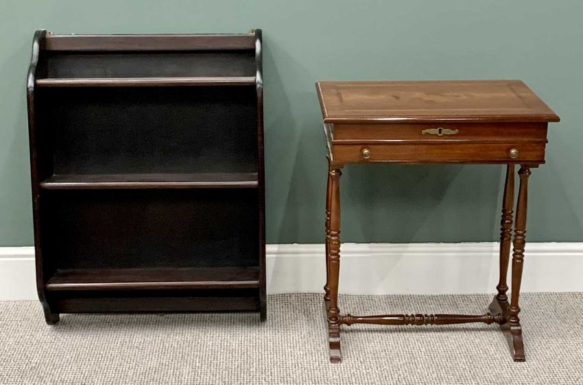 REPRODUCTION MAHOGANY JEWELLERY TABLE - having inlaid detail to the top, lifting to reveal an interior mirror and divided sections, with a single drawer to the front, on turned supports, 70cms H, 59cms W, 39cms D & VINTAGE WALL HANGING BOOKSHELF - shaped to the top and bottom having three open shelves, 84cms H, 64cms W, 21cms D
