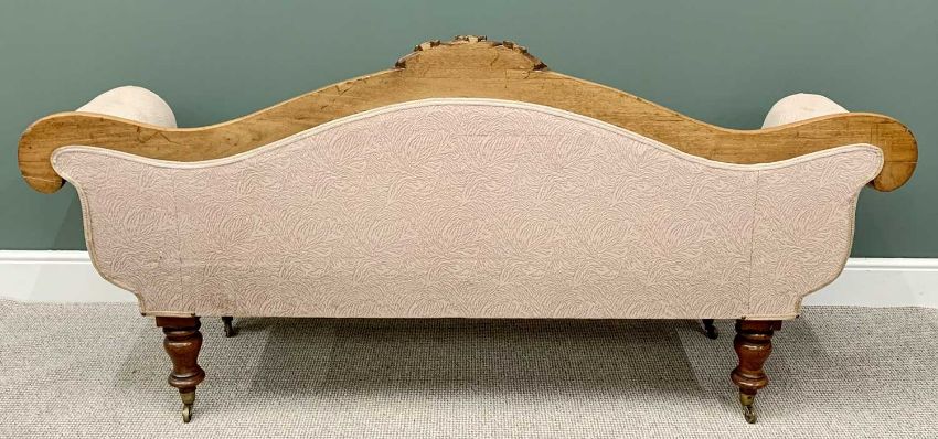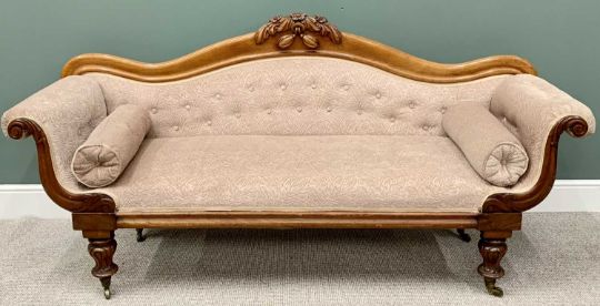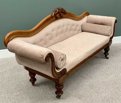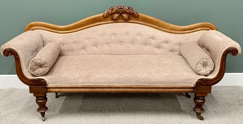 VICTORIAN MAHOGANY SCROLL END SETTEE - having leaf and floral carved detail to the crest, leaf carving to the scrolled arms, button backed upholstery, round bolster cushions, on turned and carved supports with brass castors, 110cms H, 212cms W, 62cms D