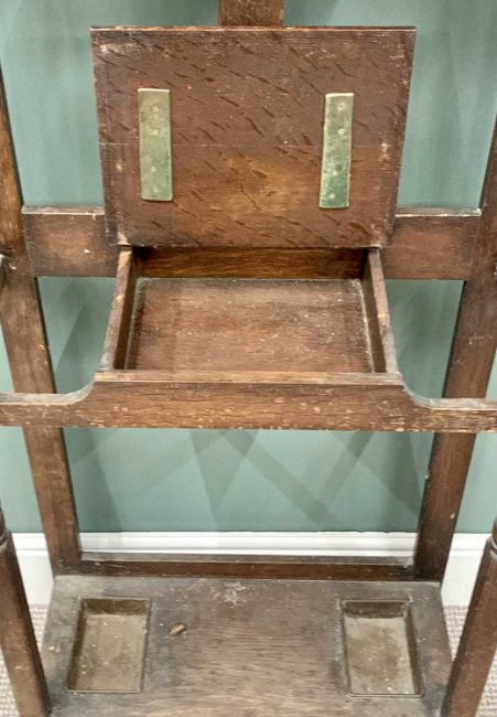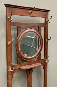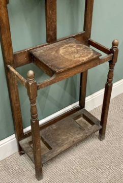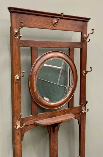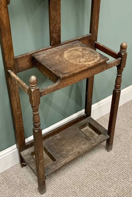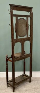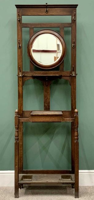VINTAGE OAK MIRRORED HALLSTAND - having a central circular framed and bevelled edge mirror, lower lidded glove box, bottom shelf drip trays intact, 190cms H, 61cms W, 29cms D