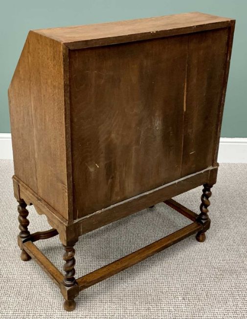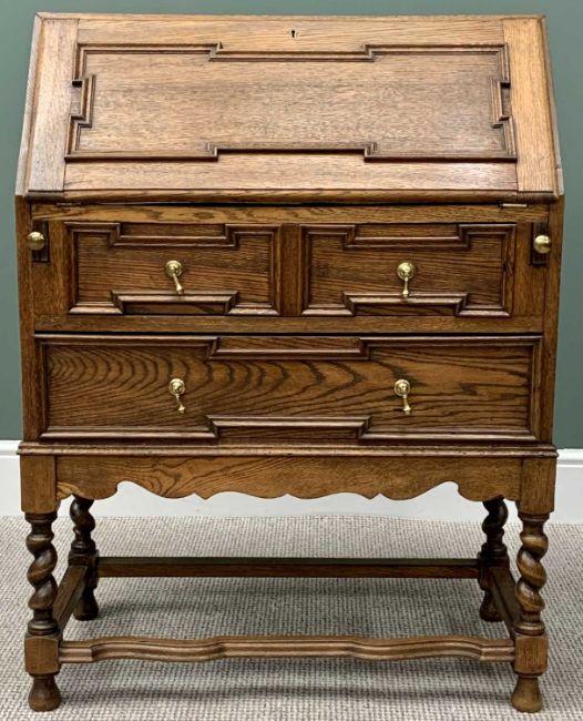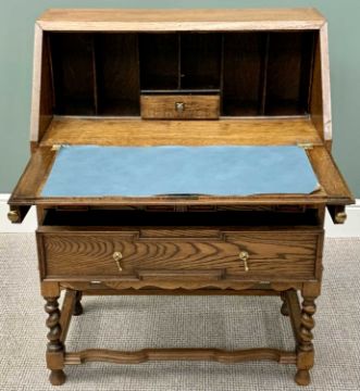 VINTAGE JACOBEAN STYLE OAK FALL FRONT BUREAU - having a fitted interior over two long drawers, on barley twist supports with shaped front stretcher, 101cms H, 76cms W, 41cms D