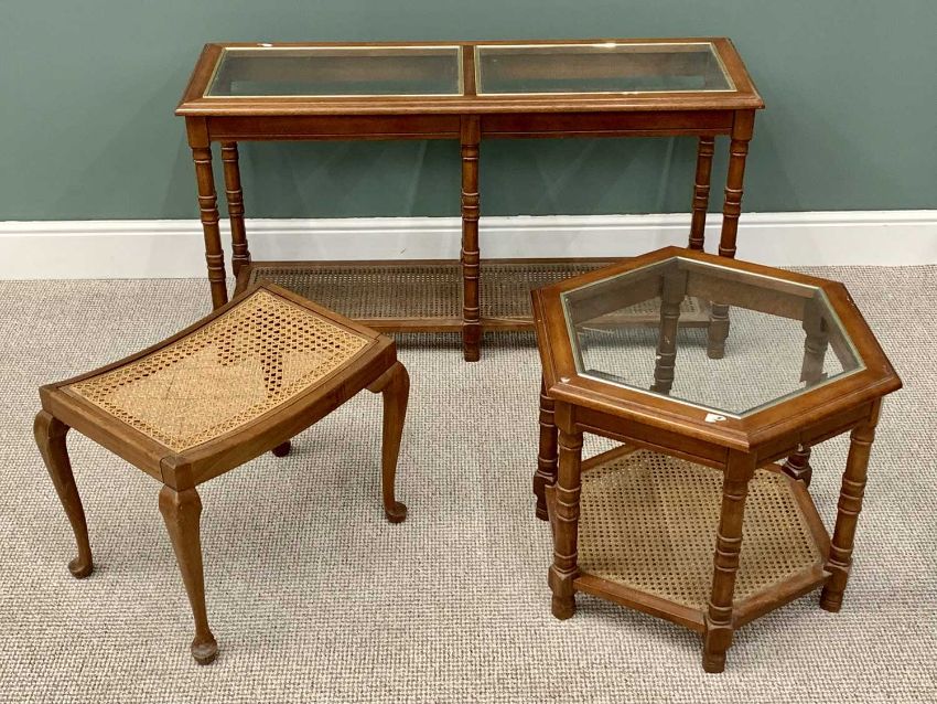 ANTIQUE STYLE MODERN FURNITURE ITEMS (3) - to include a rectangular centre/coffee table having a two part bevelled edge glass top with brass surrounds, on six turned and block supports and bergere caned lower shelf, 69cms H, 129cms L, 43cms D, matching design hexagonal coffee table, 54cms H, 70x60cms top and a shaped cane seated dressing stool with lift-out seat panel, 45cms H, 57cms W, 42cms D