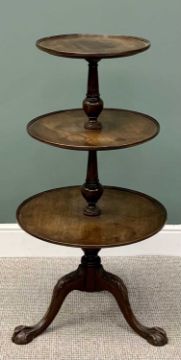 GOOD 20th CENTURY THREE TIER MAHOGANY DUMB WAITER - having circular trays separated with turned and fluted columns, on three leaf carved splayed legs, with ball and claw feet, 108cms H, 56cms diameter the largest tray