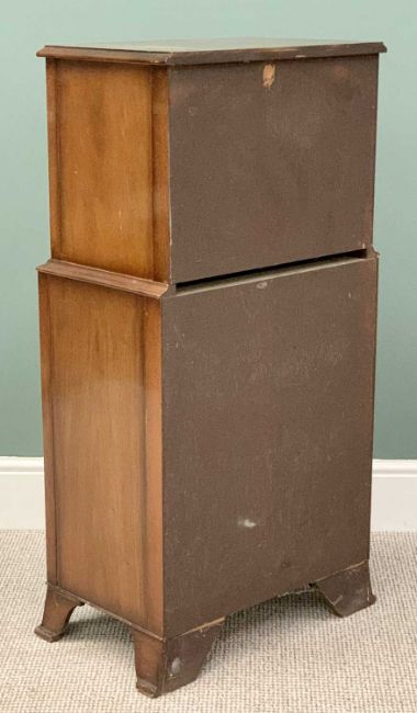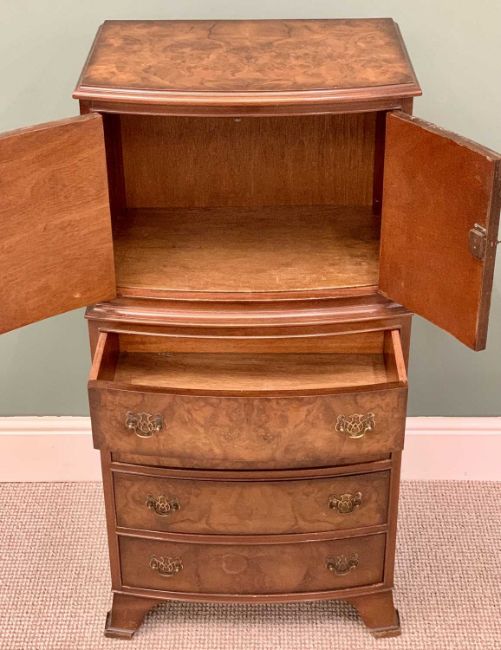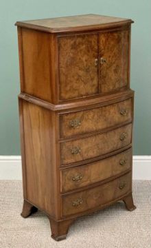 REPRODUCTION FIGURED WALNUT TALLBOY/SIDE CABINET - having twin bow fronted upper doors over four bow front lower drawers, with pierced brass backplates and swing handles, on corner bracket feet, 110cms H, 54cms W, 37cms D