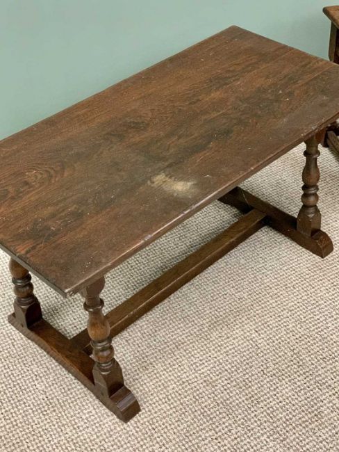 VINTAGE OAK PRIORY STYLE COFFEE TABLE - having turned and block supports, 47cms H, 92cms L, 46cms W & A NEST OF THREE SIDE TABLES - all having turned and block supports, in peg-joined antique style construction, 44cms H, 51cms W, 37cms D (the largest)