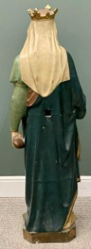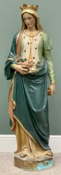 VINTAGE POLYCHROME DECORATED TERRACOTTA FIGURINE - St Elizabeth of Portugal, (Queen of Portugal during part of her lifetime, 1271-1336, she had great sympathy for the poor and would sneak bread out for them to eat, accosted one day by the King who had forbade her to do so, the food hidden in the robes miraculously turned into roses, thus thwarting the King's anger and allowing her to continue her good deeds), 135cms H, 33cms W, 28cms D