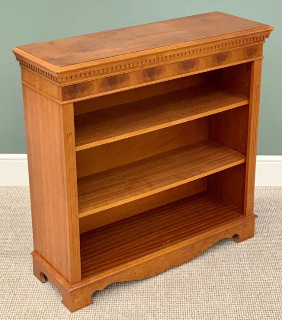 MODERN YEW WOOD OPEN BOOKCASE - with dentil cornice and reeded front decorations, on corner bracket feet, 93cms H, 94cms W, 32cms D