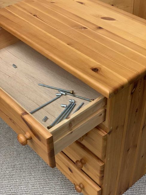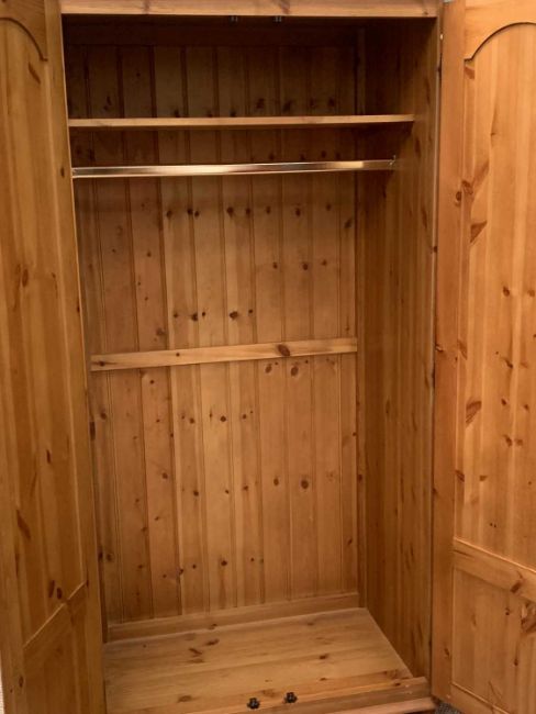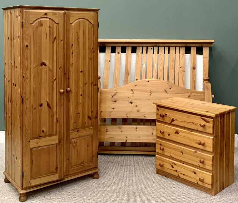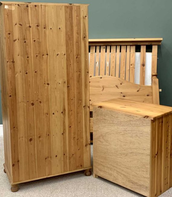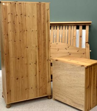 MODERN PINE BEDROOM FURNITURE - comprising two door wardrobe, 181cms H, 86cms W, 54cms D, four drawer chest, 79cms H, 74cms W, 45cms D and a double bed frame