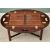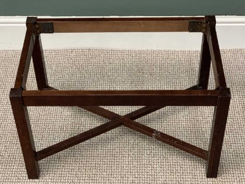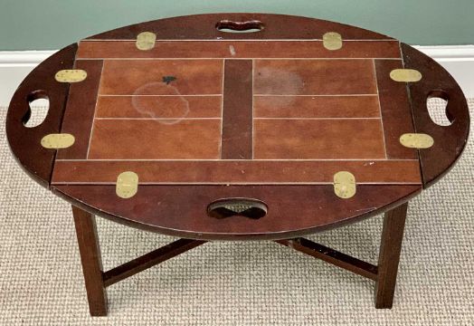 REPRODUCTION MAHOGANY BUTLER'S TRAY ON STAND - having four fold-out sides to the tray with carry handles and brass hinges, the base with reeded column supports and cross-stretcher, 54cms H, 71cms W, 46cms D
