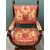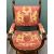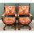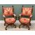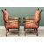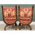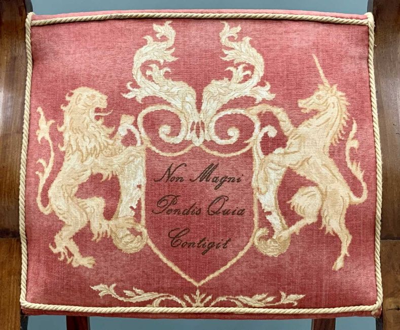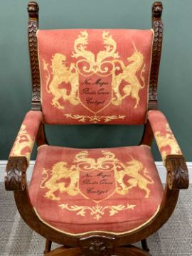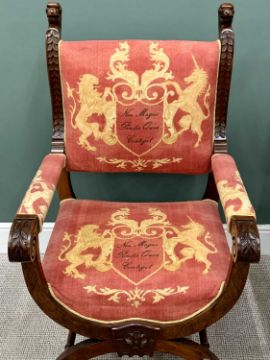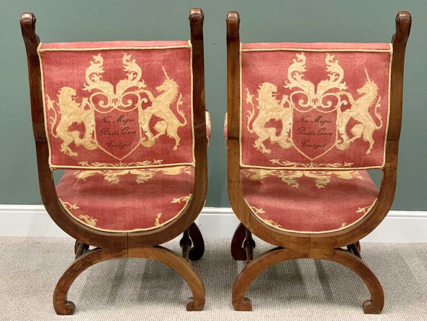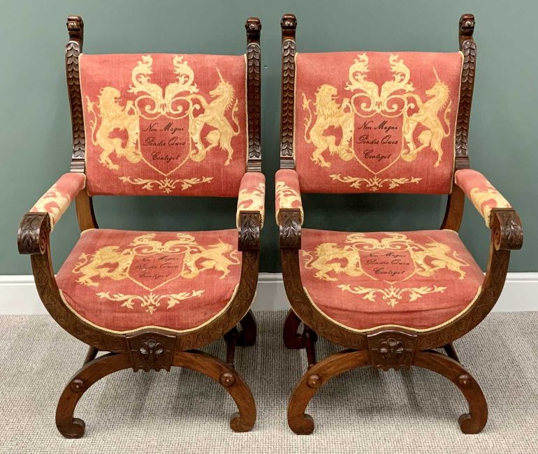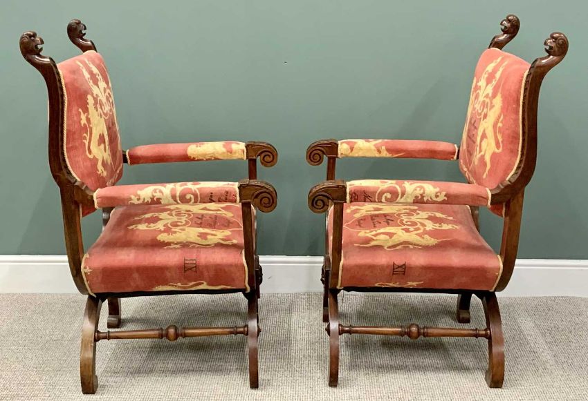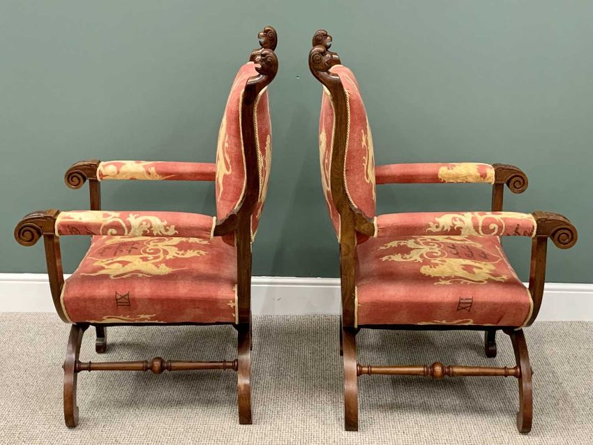 REGAL TYPE ARMCHAIRS - a pair, having "X" framed and arched stretchers, with ornate carvings and coat of arms upholstery, 121cms H, 66cms W, 53cms D