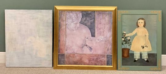 ARTIST'S ITEMS - light wood, adjustable and floorstanding easel, a rise and fall stool and three furnishing prints
