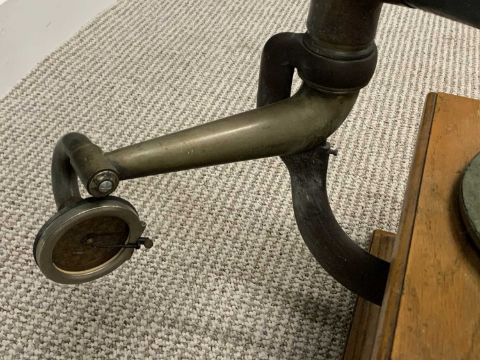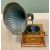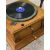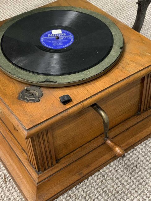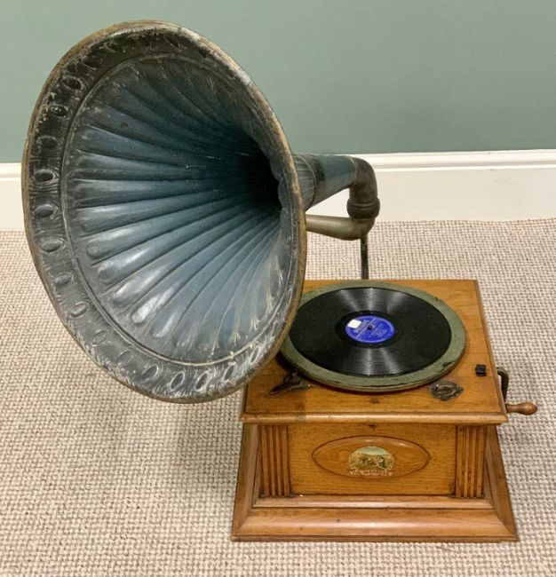 "THE GLEANERS" OAK WIND-UP VINTAGE GRAMOPHONE - with blue painted metal horn and winding handle, appears working when wound, no needle to test the sound, 78cms H including horn in place, 42cms W, 42cms D, horn length approximately 51cms, maximum diameter 52cms