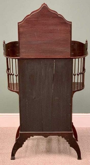CIRCA 1900 MAHOGANY SIDE CABINET - with exotic inlays, having a shaped and bevelled edge mirror top with curved side panels above twin outer shelves, galleried with spindle and bobbin turning, central single glazed door with fabric covered interior shelving, over a shaped apron and four arched feet and conjoining turned stretchers, inlaid detail showing to the mirror section, the under tier brackets to the side shelves and the support fronts, 144cms H overall, 78cms W, 43cms DGOV.UK self-declaration form completed for the sale of this item - submission reference RL8KV2N1