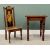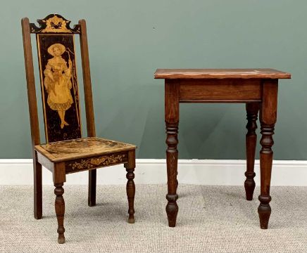CIRCA 1900 ARTS & CRAFTS STYLE NURSING CHAIR - having stained stencil type details, the back panel depicting an image of Bo Peep, 105cms H, 46cms W, 35cms D along with A MODERN STAINED PINE EFFECT SIDE TABLE - having a semi-rustic edged top, on block and turned supports, 77cms H, 62cms W, 59cms D