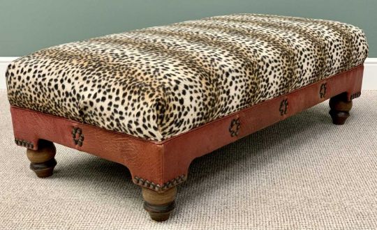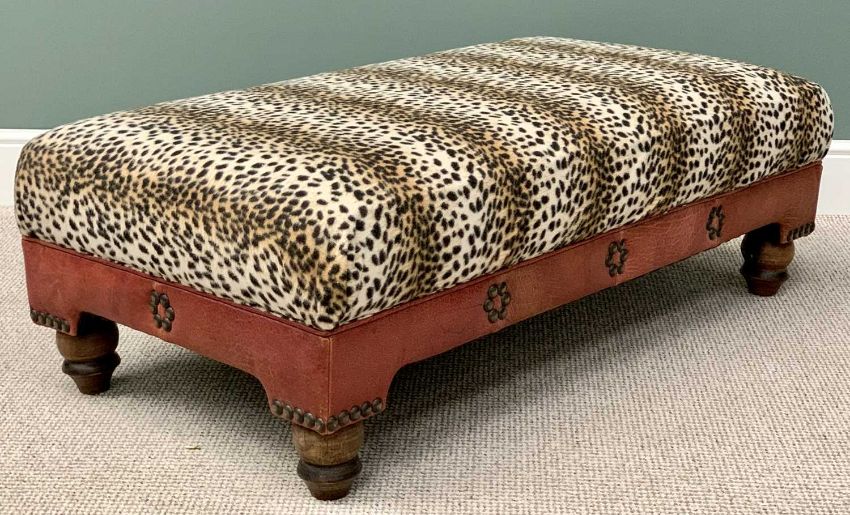 LARGE REPRODUCTION LOUNGE STOOL - in leopard print and button leather effect upholstery, on substantial turned bun feet, 43cms H, 123cms L, 66cms W