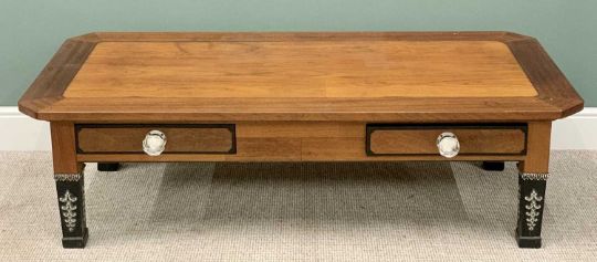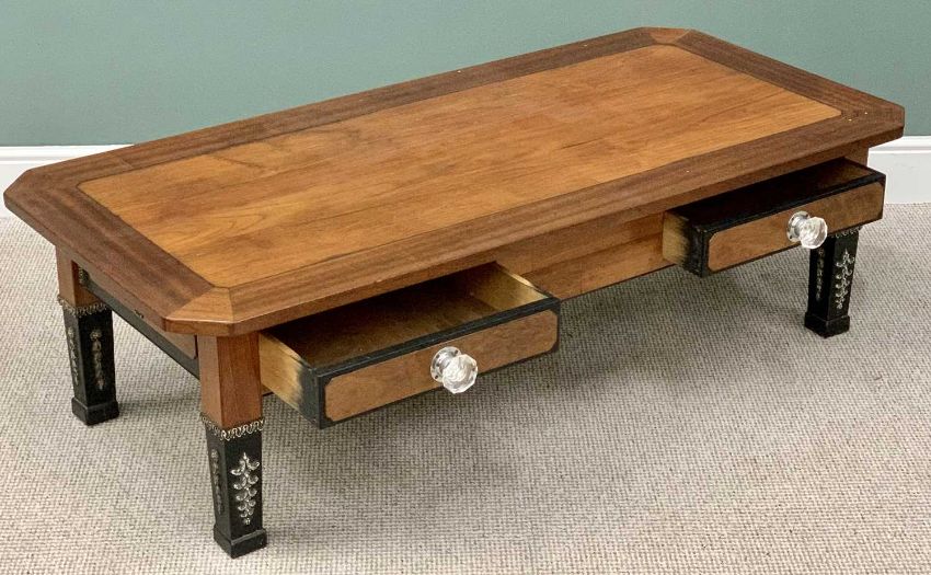 LARGE REPRODUCTION EMPIRE STYLE COFFEE TABLE - the cleated top with canted corners having two lower drawers with substantial facet cut knobs, on ebonized lower supports with fancy applied detail, 47cms H, 160cms L, 76cms W