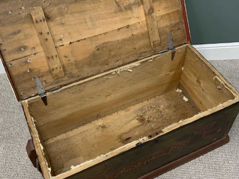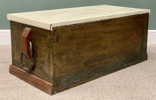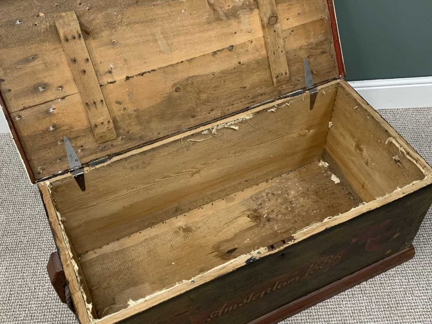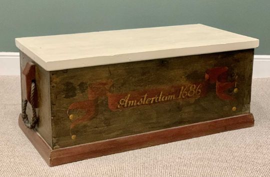 ANTIQUE PAINTED & STAINED PINE CAPTAIN'S CHEST - with rope carry handles, painted ribbon detail to the front and the word "Amsterdam", numbered 1686, 47cms H, 110cms W, 53cms D