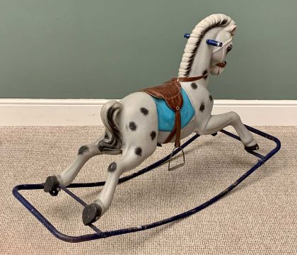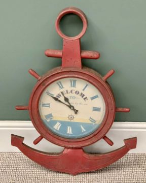 MID CENTURY MOULDED PLASTIC ROCKING HORSE - 80cms H, 130cms W, 43cms D & A TIN SHIP'S WHEEL WITH ANCHOR WALL CLOCK - the dial marked "Welcome to our Home by the Sea", 72cms H, 53cms W maximum