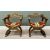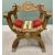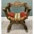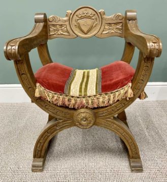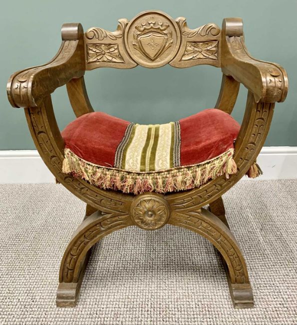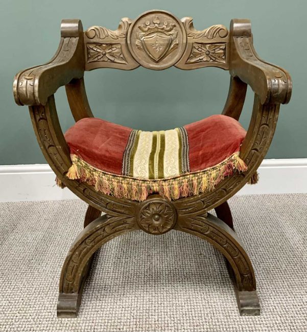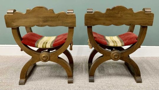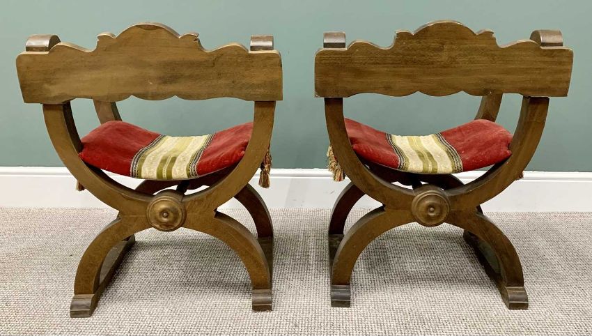 PAIR OF 20th CENTURY "X" FRAMED ARMCHAIRS - with shieldback carved detail and tasselled fabric seat pads, 78cms H, 58cms W, 58cms D