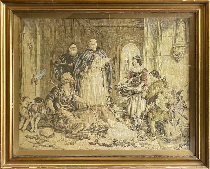 HATTERSLEY tapestry After Sir Edwin Landseer's painting of Bolton Abbey, signed at an angle lower right, framed and glazed, 83 x 102cms overall