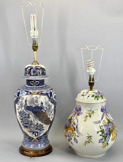 CERAMIC TABLE LAMP of baluster form, decorated in blue and white with flowers and peacocks with gilded highlights, on wooden base, 51cms H excluding fitting, and another ceramic table lamp decorated with baskets of flowers and ribbons, 38cms H excluding fitting