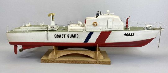 SCALE MODEL COASTGUARD MOTORBOAT - the hull painted white and red, with stand, 25cms H, 75cms L