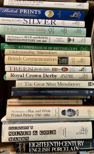 BOOKS - including 'Millers', 'Crown Derby', 'Coalport' and 'German Ceramic Marks', (within 4 boxes)