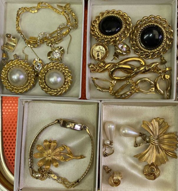 COROCRAFT, MONET & OTHER GOLD TONE JEWELLERY ETC - a good quality collection of various brooches, necklaces, bracelets, bangles and various earrings along with a Corvette lady's wristwatch and other interesting items