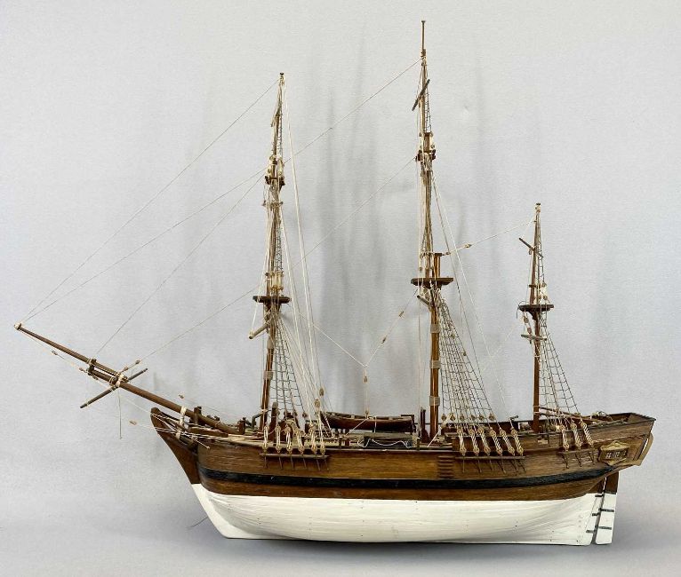 SCALE MODEL PADDLE STEAMER - SS Hjejlen - with green and red hull, on stand, 25cms H, 88cms L and THREE MASTED SAILING SHIP - of wooden construction, with cream hull, 87cms H, 79cms L